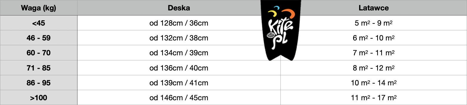 Poniższa tabela przedstawia rozmiary w zależności od wagi ridera, kompletując zestaw z dwóch latawców i deski. Zakładamy w tym przypadku pływanie w wietrze od 12 do 30 węzłów.