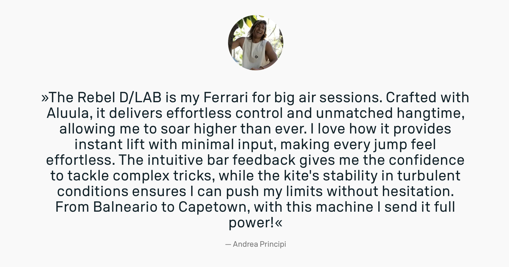 Jedną z kluczowych cech Rebel D/LAB jest intuicyjne czucie na barze, które daje absolutną pewność podczas lotu. Pięcio-poprzeczkowa konstrukcja zapewnia doskonałą stabilność i trzyma latawiec „na miejscu” nawet w turbulentnych warunkach, pozwalając pewnie pływać przy mocnym i nierównym wietrze.