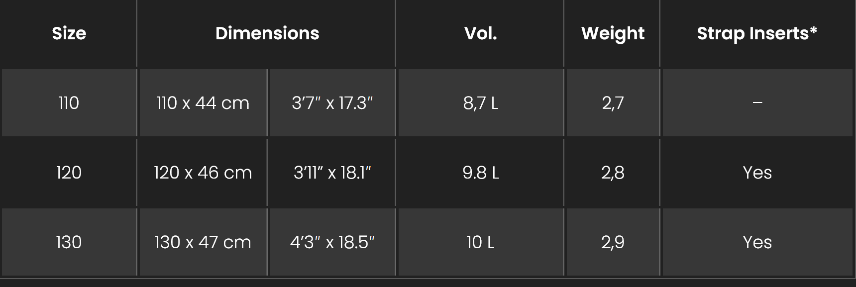 Asortyment obejmuje trzy rozmiary: 110×44 cm, 120×46 cm i 130×47 cm, przy czym mniejszy rozmiar zadowoli wszystkich zaawansowanych użytkowników. Modele 120 i 130 są wyposażone w pada i inestry do przykręcenia strapów. 110 ma również pada lecz nie ma miejsca na wkręcenie strapów. Wszystkie wyposażone są w system Twin-Tracks dla maksymalnej kompatybilności.