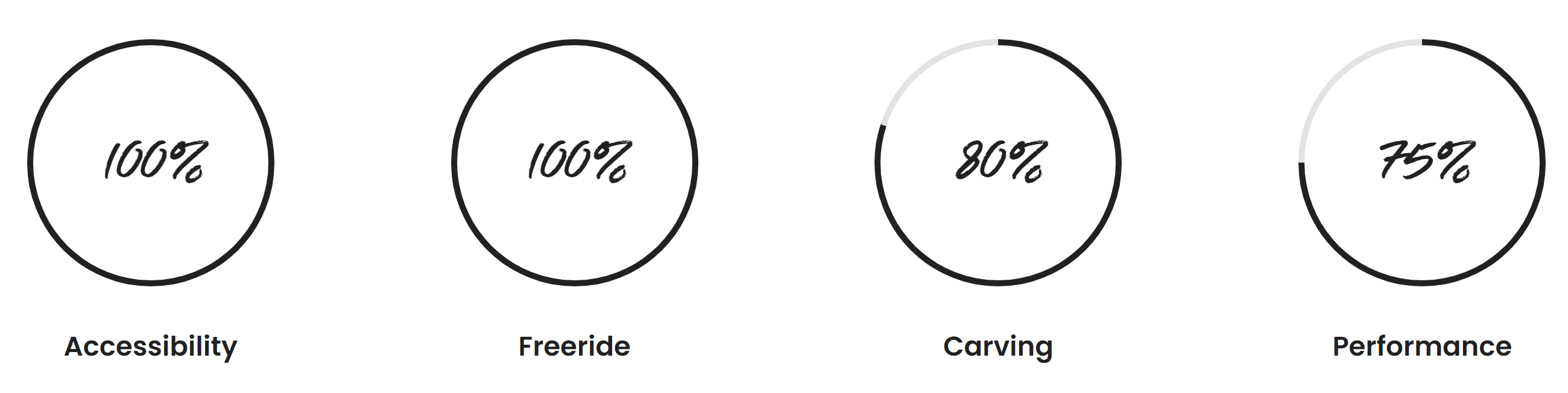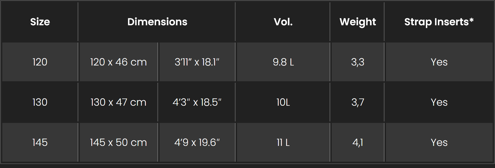 Asortyment obejmuje trzy rozmiary: 120×46 cm, 130×47 cm i 145×50 cm, aby dostosować się do wszystkich rozmiarów i poziomów użytkownika. Wszystkie są wyposażone w nowy pad na całym pokładzie ze sztruksowym wzorem, wstawki na trzy footstrapy oraz system Twin-Tracks dla maksymalnej kompatybilności z dowolną folią.