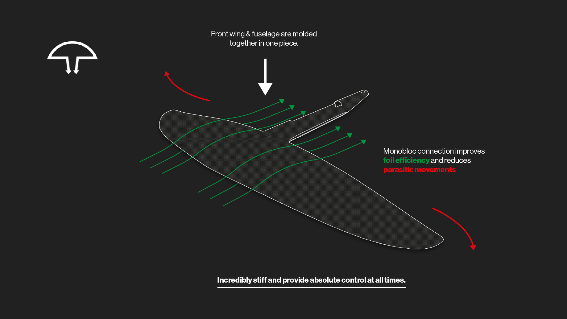 Na łączeniu przedniego skrzydła z fuselagem powstają największe przeciążenia podczas pływania. Karbonowe foile marki F-ONE wykonane zostały w technologii monobloc, czyli przednie skrzydło i fuselage formowane są w jednej części. Takie rozwiązanie konstrukcyjne eliminuje niepożądane wibracji powstałe podczas pływania, a także stanowi bardzo lekkie i wytrzymałe połącznie. Skrzydła w technologii monobloc są bardzo sztywne i zapewniają doskonałą kontrole. By ułatwić transport zestawu fuselage podzielony został na dwie części. Łączenie znajduje się za masztem, czyli w miejscu gdzie przeciążenia są mniejsze.