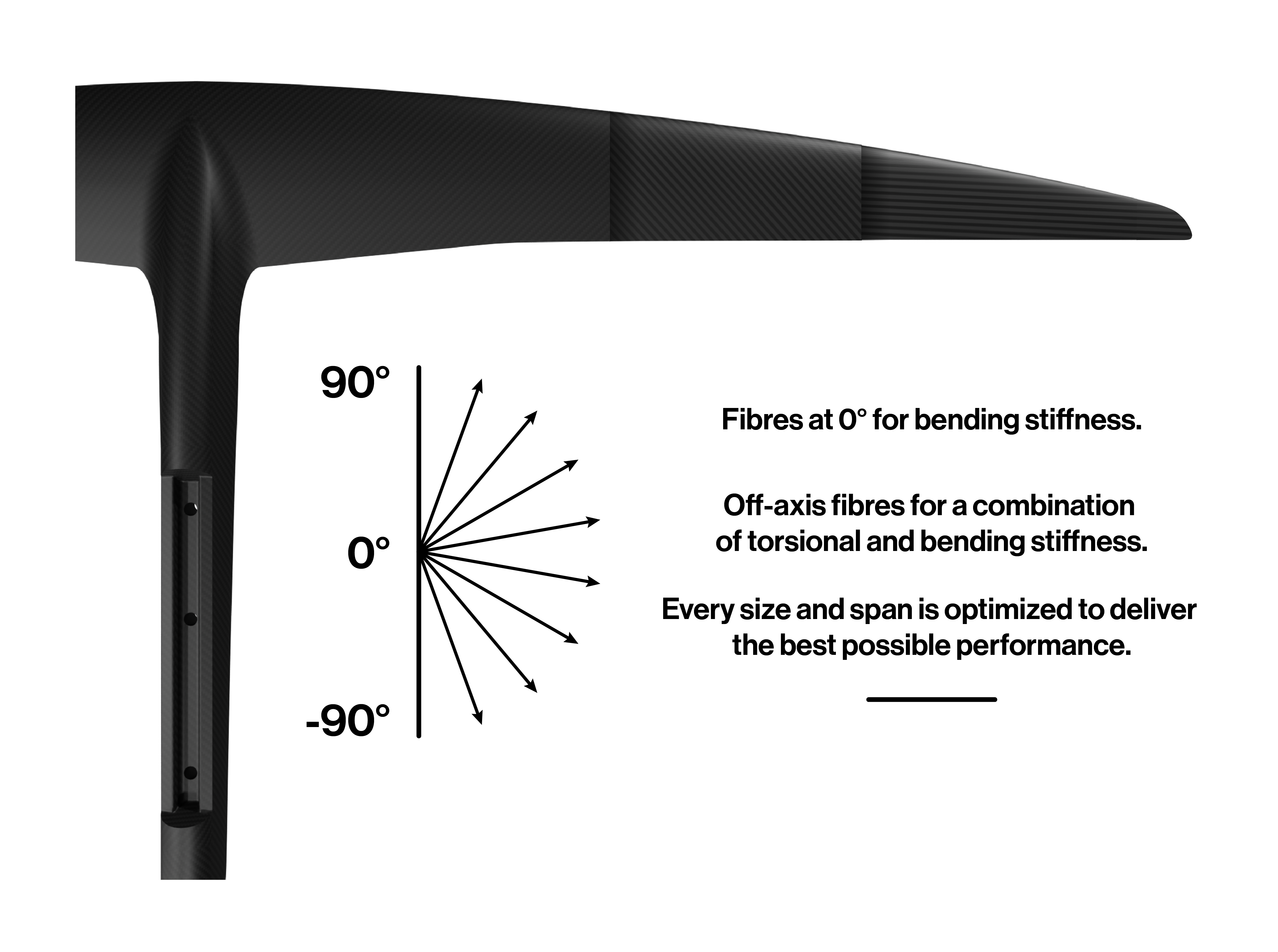 Karbonowy maszt F-ONE zaprojektowany został w technologii full monobloc, co oznacza, że wszystkie jego elementy (top plate, łączenie titan 2 i miecz) są ze sobą na stałe połączone. Warstwy włókien karbonowych zostały wstępnie nasączone żywicą epoksydową i układane są naprzemian wzdłużnie (kąt 0°) i poprzecznie (kąt 45°). Takie rozwiązania zapewnia maksymalną sztywność, lekkość i wytrzymałość.